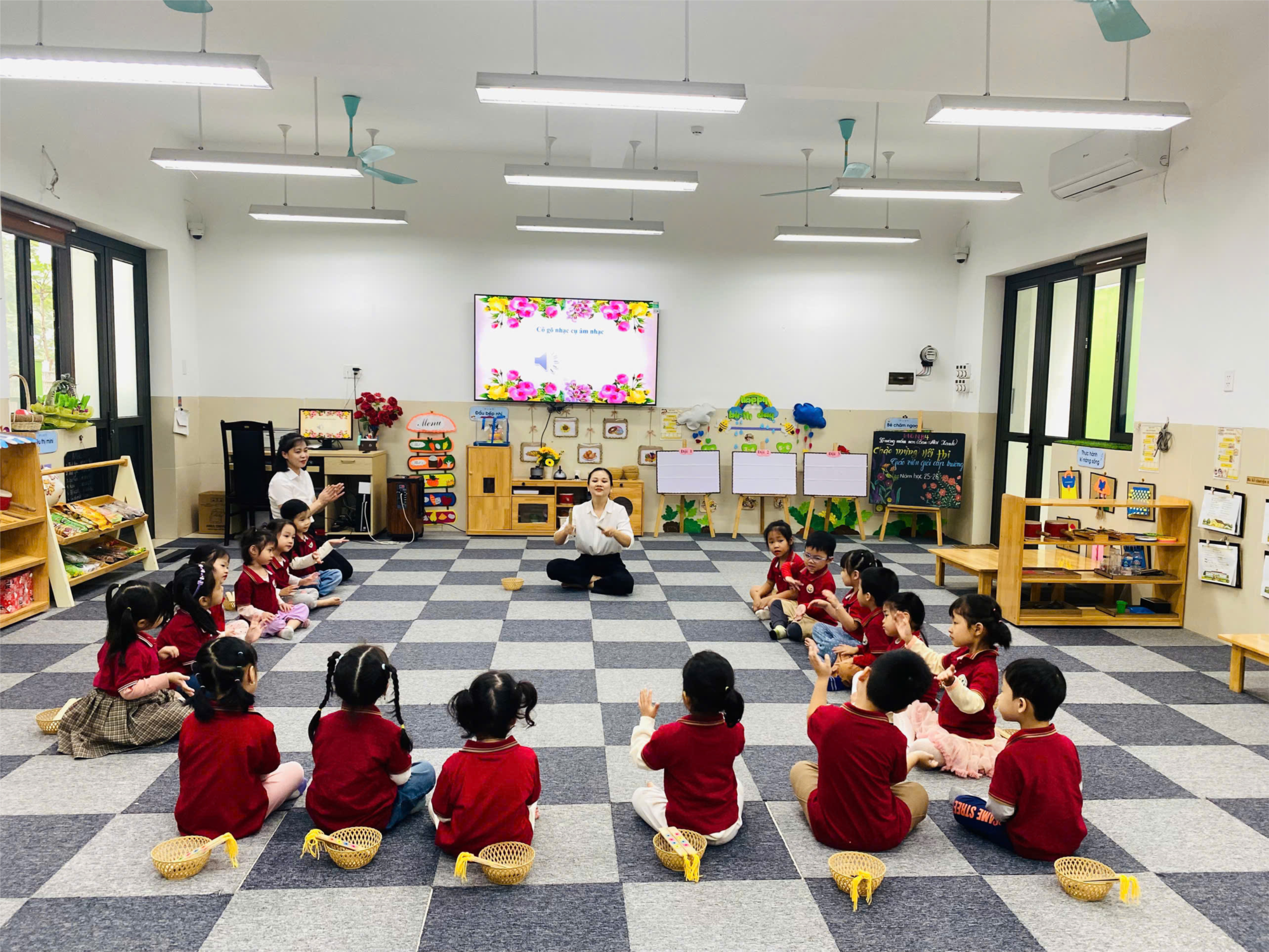 Với đề tài các be skhoong chỉ quan sat mà sắp xếp đồ vật theo qui luật mà còn được học quy tắc kết hợp vận độngâm nhạc thật sôi động , tran trí dụng cụ âm nhạc theo qui tắc AAAB..
